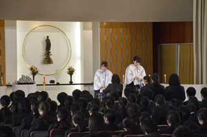 成道会は仏教の開祖であるお釈迦様がさとりをお開きになった日(12月8日)に合わせて、お釈迦様のお徳をたたえ、感謝を申し上げる行事です。全校生徒で「衆会」や「さんだんのうた」を歌い音楽式典を厳粛におこないました。