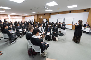 午後は、リガ文化学校で日本語教師をされている先生から、中学2年生に向けて、「海外で働くこと」ということをテーマにお話いただきました。熱心に耳を傾ける生徒の姿が印象的でした。留学生の皆さんは本学舎へ移動し、合唱コンクールを見学し、茶道部による茶道体験をしました。初めての抹茶の味はいかがだったでしょうか。